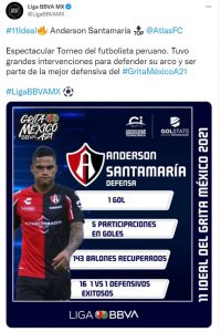 Anderson Santamaría ha sido uno de los jugadores nacionales más destacados en el extranjero esta temporada 2021. En el Atlas ha podido consolidarse al punto de ayudar a su equipo a levantar el título de la Liga MX. Por consiguiente, ser elogiado por las mismas redes sociales del torneo mexicano.