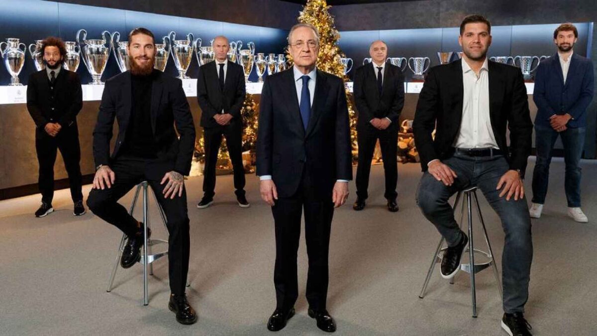 El presidente Florentino Pérez acompañado de Zidane, Laso, Ramos, Marcelo, Reyes y Llull felicitaron el 2021.