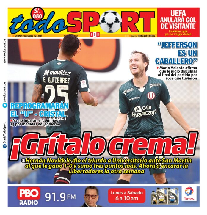 Portada impresa – Diario Todo Sport (16/04/2020)