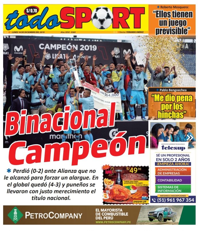 Portada impresa – Diario Todo Sport (16/12/2019)