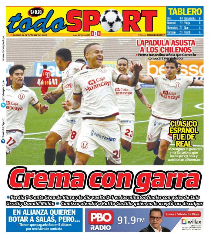 Portada impresa – Diario Todo Sport (25/10/2020)