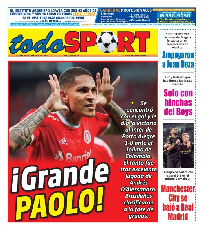 Portada impresa – Diario Todo Sport (27/02/2020)