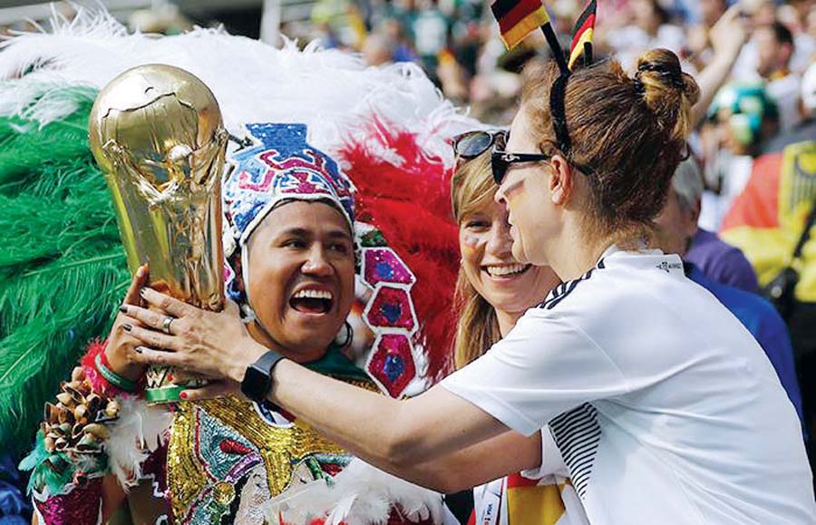 PÁSAME LA COPA.- Parece decirle el fanático azteca a la guapa alemana, quien se vio sorprendida con el accionar del mexicano. Al final se fueron como buenos amigos.