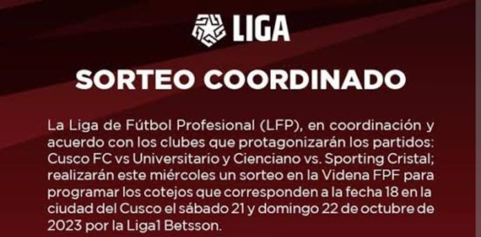 La Liga de Fútbol Profesional (LFP) realizó la tarde de este miércoles 4 de octubre el sorteo de las fechas y horarios de los partidos correspondientes a la fecha 18 de la Liga 1 Betsson.